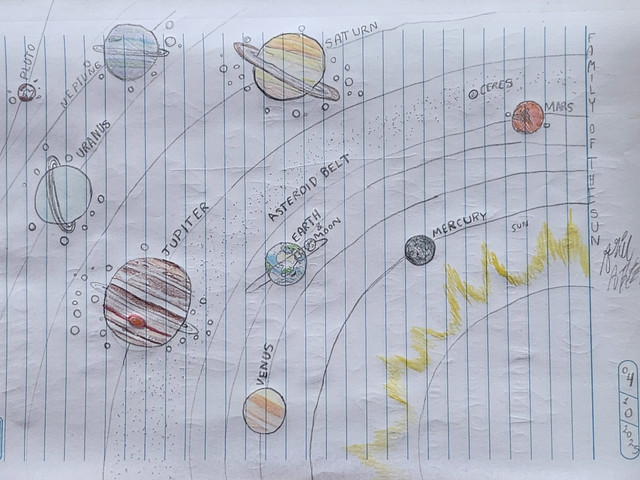 A drawing about the Solar System. The objects are nearly in the right scale but the distances are not. (And I am not sure about the size of the comet's coma. It may be wrong.) The whole Solar System is not included in this image and the smallest objects visible in the image are about 400 km in diameter.The image includes: