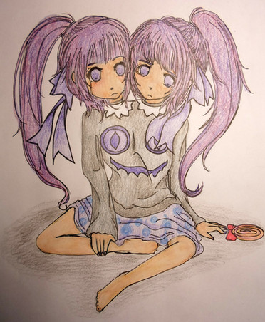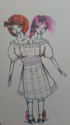 The drawing I mentioned in my recent journal entry. The story behind it was after working on a blog I made ( yes yes laugh at me later ) I did a post that involved a conjoined twin and the image of a tiny skeleton with one head but two bodies. The wheels in my head churned away and I thought what if one lived long enough to be a cute little girl. and tada here she is.I plan to use her for In the Crypt once I get around to animating the damn show. I might start making backgrounds soon so I won't have to draw them every frame. Anyway back to the girl she doesn't have a name yet but she has two vocal chord sets resulting in a dual voice effect . Debating a split personality or not
