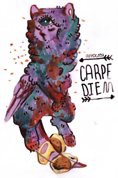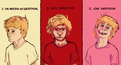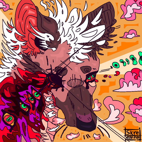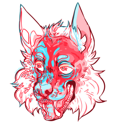 I love the mix of hard red with soft purple. It's also a nice touch making the blood the same colour as the background as it ties everything together very nicely. The harsh, jagged-style lineart adds to the overall feeling of aggressiveness to the picture. I think it's really cool how it looks like the dog is breathing out the soul of whatever it was they probably just took a bite out of. It's very dark but also very artistic. Only thing I can find here that might have made this drawing a little "better"??? (*I don't even know if that's the right word since this is already awesome), would be the dark red around the eye. Since everything else has the bright red, it may have made his eye pop out at you more if it were brighter. Other than that I really like this drawing and your style is 10/10