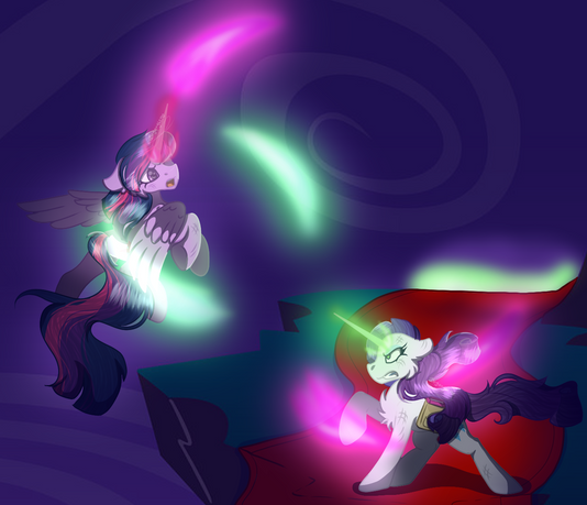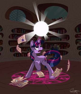 After reviewing the spell one more time, Twilight carefully begins to manipulate the magical aether permeating the space around her. As the forces gather and concentrate, the room seems to darken while sparks flash around the young unicorn. A small whirlwind entrains papers and debris, and the pages of the spellbook turn rapidly under its influence...This drawing is intended as a sort of sequel to "A Difficult Spell" fav.me/d6ocndc . There will probably be more drawings of Twilight to come.