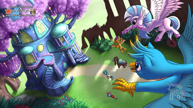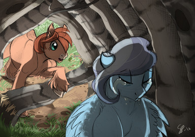 A scene from Chapter 33 of Sharaloth's amazing fanfic, Harmony Theory. The injured Star Fall is defended by her loyal friend and griffon bodyguard, Astrid.Drawn for Equestria Daily's 4th friend-off event and because I really really really like Harmony Theory.