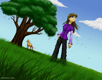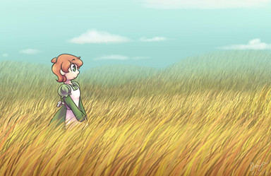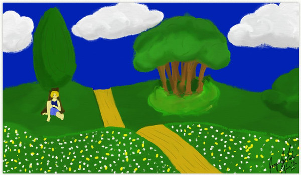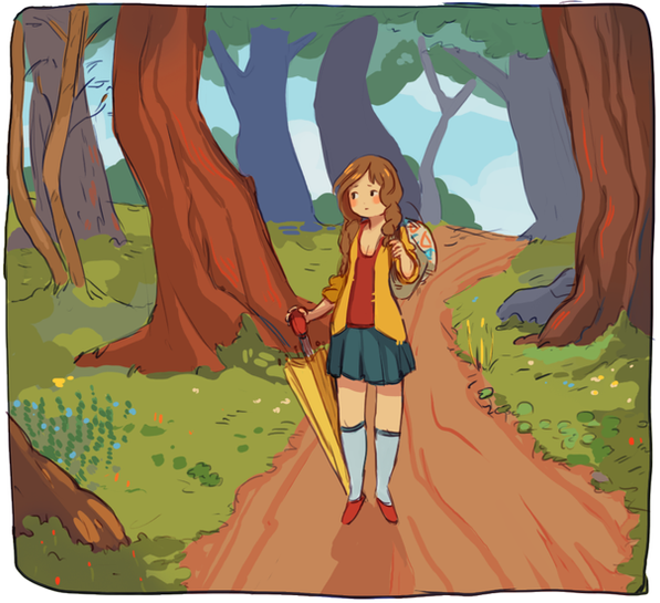 A beautiful landscape and the character looks adorable! I like the shading on her and on vegetation too.