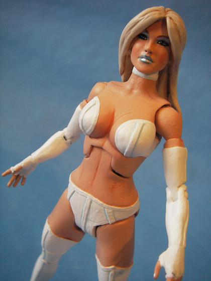 Born deformed, Valerie Beaudry was exploited by a ruthless industrialist who forced her to fight Wonder Woman. She is also a vastly under-appreciated/-utilized character who could speak to mental/physical abuse.Swan started out as a Power Girl that I added Hawkwoman wings to. Most of the uniform details are made using GreenStuff.