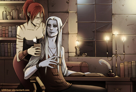 There may come a day when I do not draw Tev and Dren being cozy in a low-lit house in Balmora, surrounded by pillows and tea…but it is not this day. At least this time there is a bonus doggo!