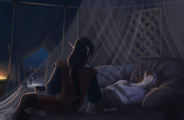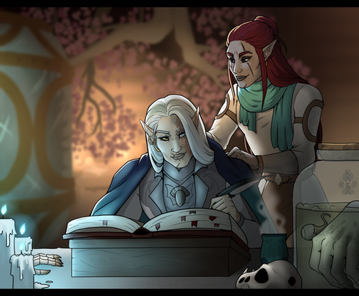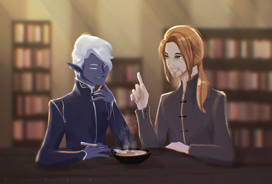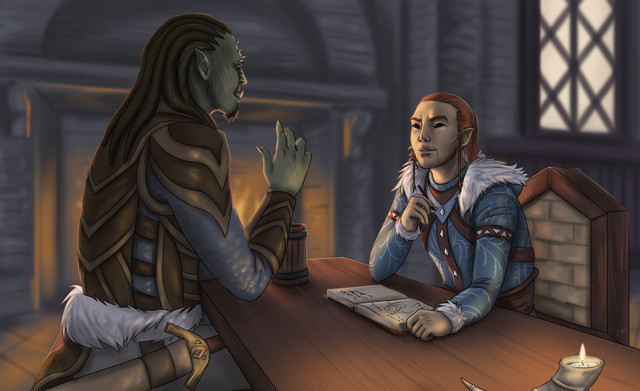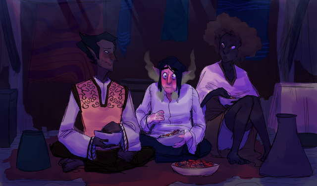 Just TRY AND STOP ME from drawing more Tev and Dren doing cozy things. This time they’re eating together because I live vicariously through my characters and I am so interested in Morrowind food, and also I love drawing clutter! You’ve gotta deal with it!!Morrowind belongs to Bethesda