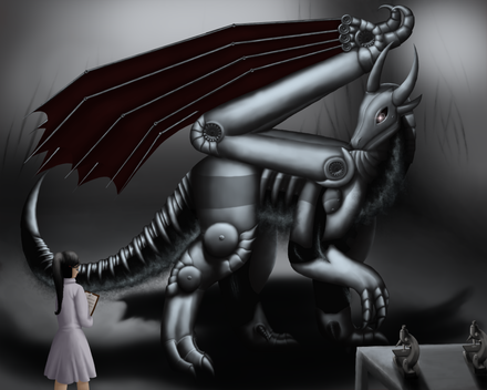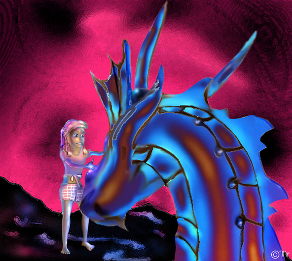 Okay, first let me say that this looks absolutely awesome. I love the colors and how the reflections make the dragon look metallic, or even liquid. Awesome touch. Second, the background is just simply put: Awesome. It adds a surreal effect to the entire drawing, and adds to the mystery and to the power of friendship between the two characters. Overall, another great image by you.