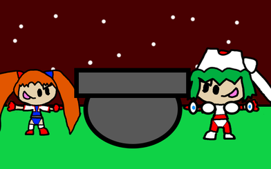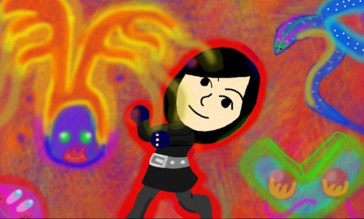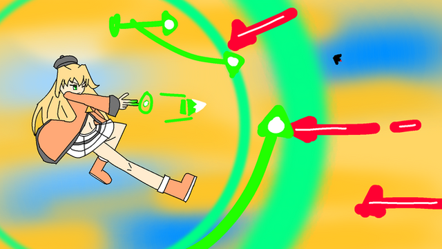 The girl in the image is Tanya Tootsie, one of the three playable characters from the arcade game called Splat!, a game that involves her and the other two playable characters, Mark the Slob, and Harry the hood, wandering around a playfield while foods cascade down from the top. The player grabs a pie (for example) and chucks it at enemies or the other player.In this image, I've switched her "cocktail dress" out for this leotard and in an anime-style like my Smash TV fanarts, I've also made use of the drippy tool for this image.