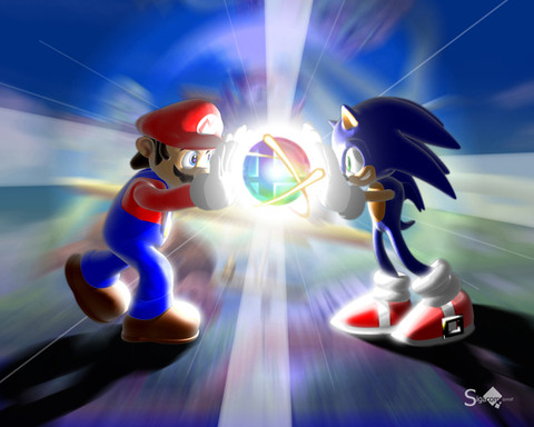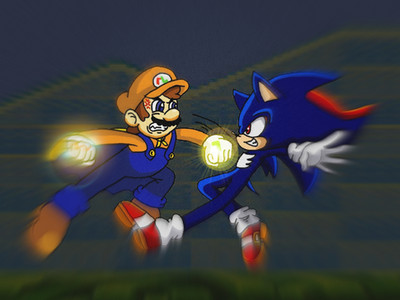 I love the coloring of this and the arua of both Sonic and Mario. However I can sense a few things I didn't like. First Mario's arua looks to sketchy with bold lines that look more like electricity than fire-plasma type of elemental ability. And sonic should have a mouch more solid looking arua like in the games when he's doing a dash like that, however if your trying to copy the game's idea then their should only be a trail of sparkles and stuff like that. As for the background it is well done however its a little to blurry to my liking however all in all this is a good pic and a job well done!