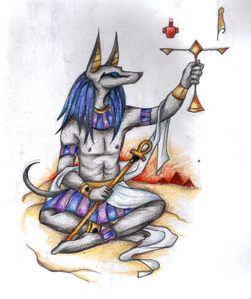 Yinepu/Anubis with the Scales, a heart, and the feather of Ma'at.The inscription on the wall is apparently a passage from the Book of Going Forth by Day, about the heart not speaking out against the soul (According to the site, I didn't double-check).