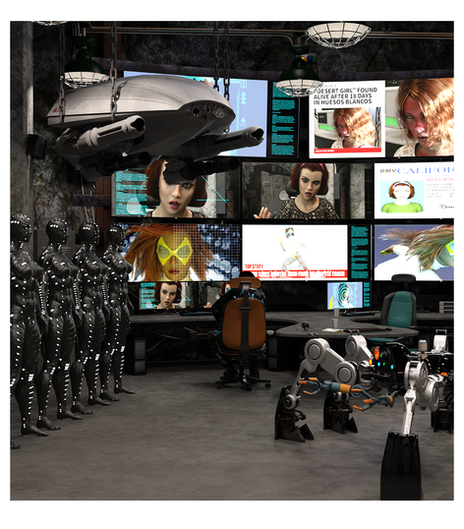At the special chime from their mobile phones, the sleepers connected in to the control centre, their minds blank, ready for re-programming and upgrades to their post-hypnotic instructions...This isn't an exact homage - I just re-watched On Her Majesty's Secret Service (1969) and loved the idea of hot hypno-sleeper agents around the world, so if I remade it with dommebots rather than Blofeld, here's how the control room might look
