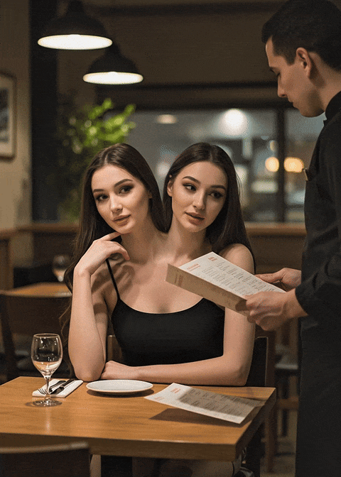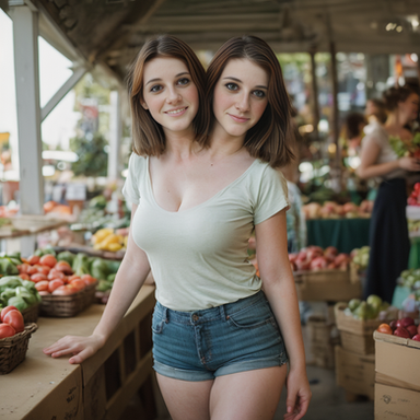 As he approached, the woman turned to look at him, her lips curving into a slight smile. To his astonishment, another head, identical to the first, turned as well. They were conjoined twins, sharing a single torso and set of limbs, but with two distinct heads and necks. Jake paused, taken aback by the unexpected sight.