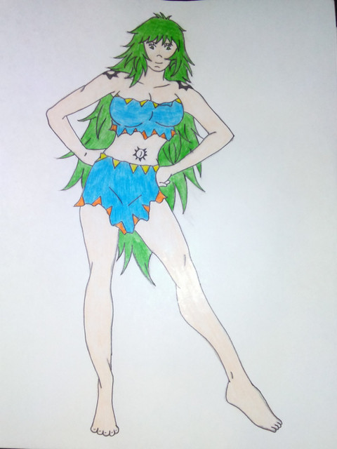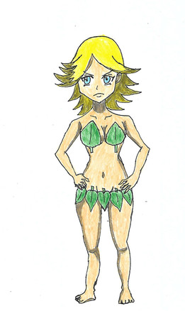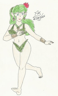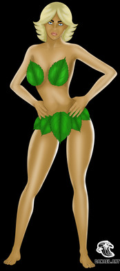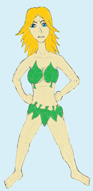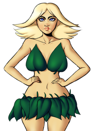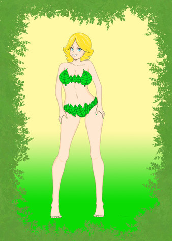 WatercolorIt’s Princess Christi, the protagonist of the Princess Planet webcomic in a leaf bikini. This is from a comic where she lost everything after playing poker with some skeletons and had to cover up with leaves. Fortunately for her she later found out that they were using a loaded deck and got her gear back by beating the lead skeleton in an arm-wrestling contest.