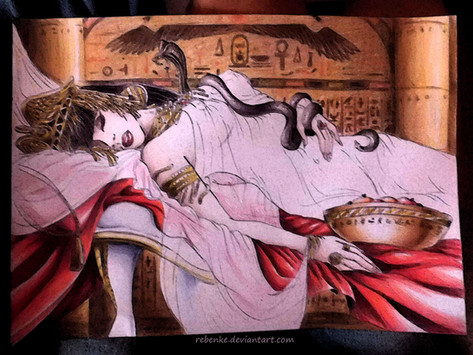 Cleopatra's alleged death.I'm not sure why I drew her entirely naked as I have literally no concept of anatomy or art in general. Only a sketch though, to show I'm still alive.