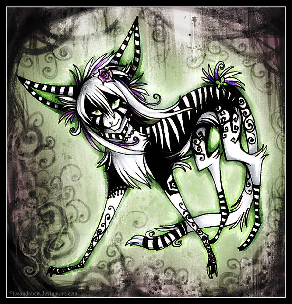 -he is a feline hybrid, some sort of mix between cheetah (as seen in the body type and somewhat in the markings) tuxedo cat (markings also), lion (weird mane-thing, I guess that's my only explanation of that.. xD), and white tiger (tail) I dunno, he's basically just one big black and white mess.