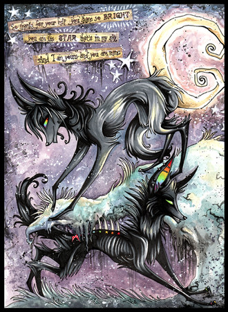 And then you hit us with this. This beautiful creation with your classic, trademark style of angular spirals and stars and apathetic yet emotional animal creatures and honestly I'm just happy to keep looking at it. Unfortunately, my "new deviations" messages are loading up so I needed to go through and comment on the pieces I've wanted to go into further detail with.
