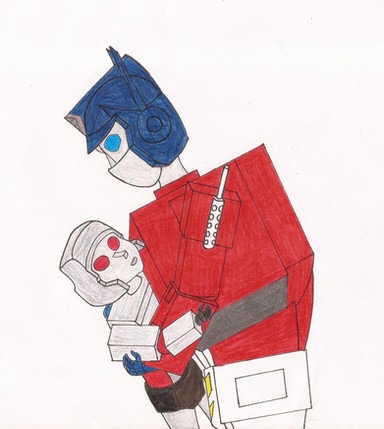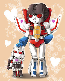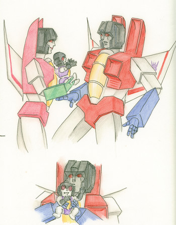 Cute little Starscream. Before he came everything but little... and maybe cute... well ok, he IS still cute. Atleast occasionally.Soundwave was obvious choice for the 'father' figure. I considered couple others, but he is the family man. If he has the nerves to get along with Rumble and Frenzy, he shouldn't have any problems with Screamer.