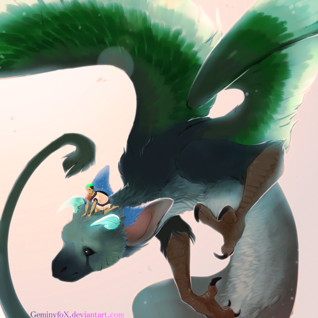 It's been a while since you drew fanart of TLG , and I'm glad to see a new drawing, you always make a fantastic work drawing them. Trico looks so adorable with the yes closed and I like you drew both charas, good detail with Trico's feathers.