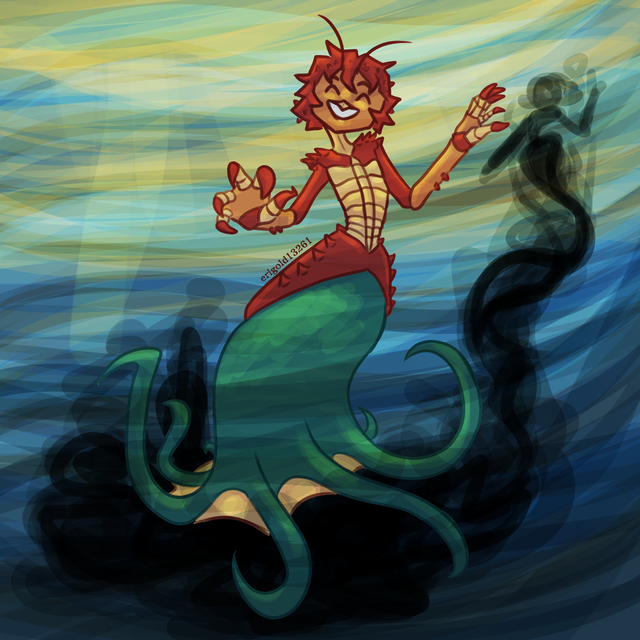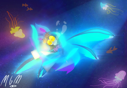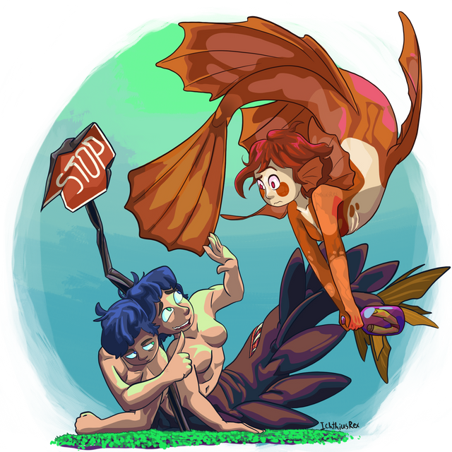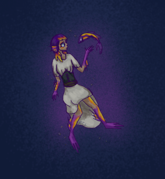 At least she had the sunsets to enjoy, even if they were dreadfully lonely. In her head Tip wished she could enjoy them with someone, anyone really. Then, as if to reply to her thoughts, a fish came erupting from the surface of the water beside her. Her attention turned to it, and it fell back beneath the waves. ‘Perhaps it’s leap was to escape something?’ Tip thought as she rolled over to look below. But what she saw was no predator giving chase, in fact it was plainly something unable to move at all given the sign post through it. What Tip beheld was in fact, someone, or more aptly two someones stuck together below.