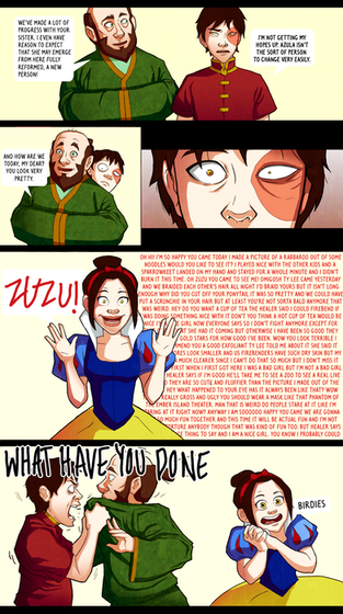 Y'know, Katara doesn't look that bad with just half-loopies. Also, Zuko's "peace out" had me in giggles.