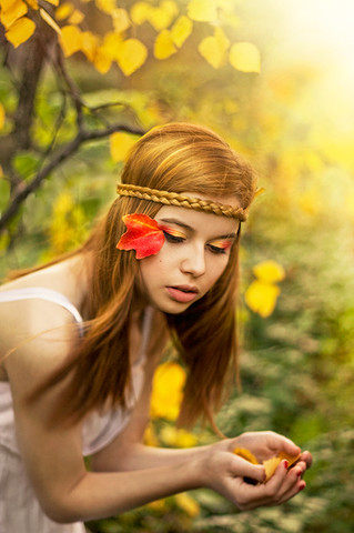 Beautiful! I love the colours.. The way her red hair and the leaves contrast with the green background.