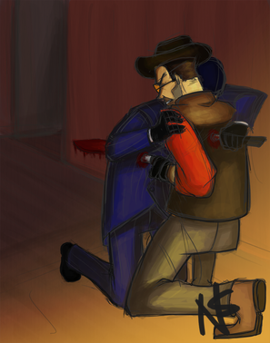 When I said I went in a different direction...well, it's in a *really* different direction. It's because your aforementioned feel-punching picture made my patheit OTP-loving brain immediately hold its hands over its ears and sing happy songs and refuse to believe that something like that could ever possibly happen. So instead I thought, 'well, why would Sniper ever hug the enemy Spy of all people neither of them are exactly huggy people and especially why would he if they weren't already in a relationship because if they were in a relationship and Spy was stabbing him nope nope nope nope.' And then that collided with something I read once, and well, this happened.