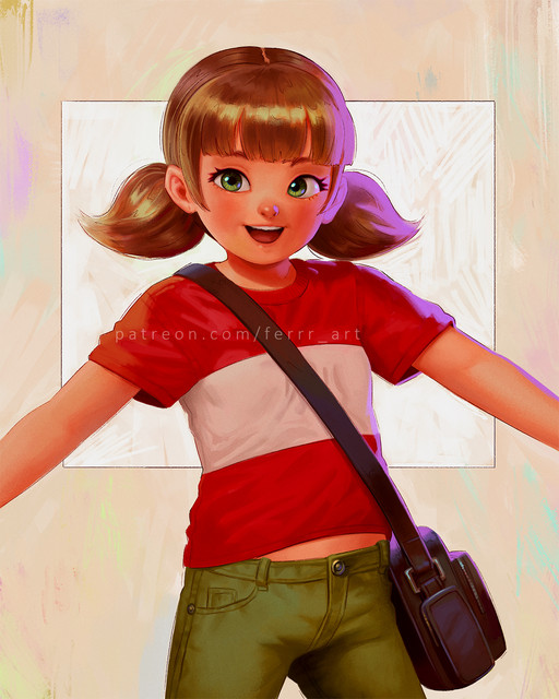 She is no troublemaker, she is a tomboy pure and simple.Β She also looks very happy, just hit a home run perhaps?Β Β Beautiful work.