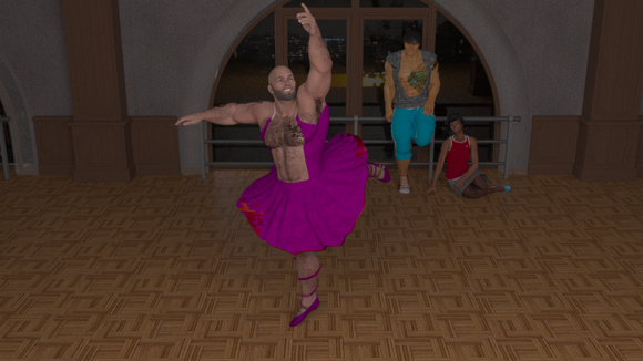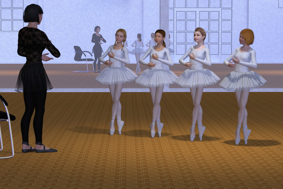 Fathers and mothers learn ballet. Children back them.10-11 years old daughters shoot video of their father dancing ballet. Mothers wait for them.