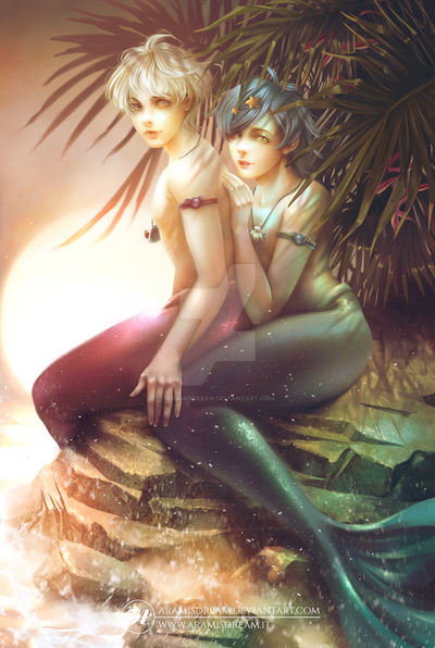 Gorgeous and faved ten times over! I will be putting the print of this on my Christmas list. I don't see mermen drawn that often, let alone young merboys! I love they're looks too, like "Get out of our cove. This is our territory. Humans bad."