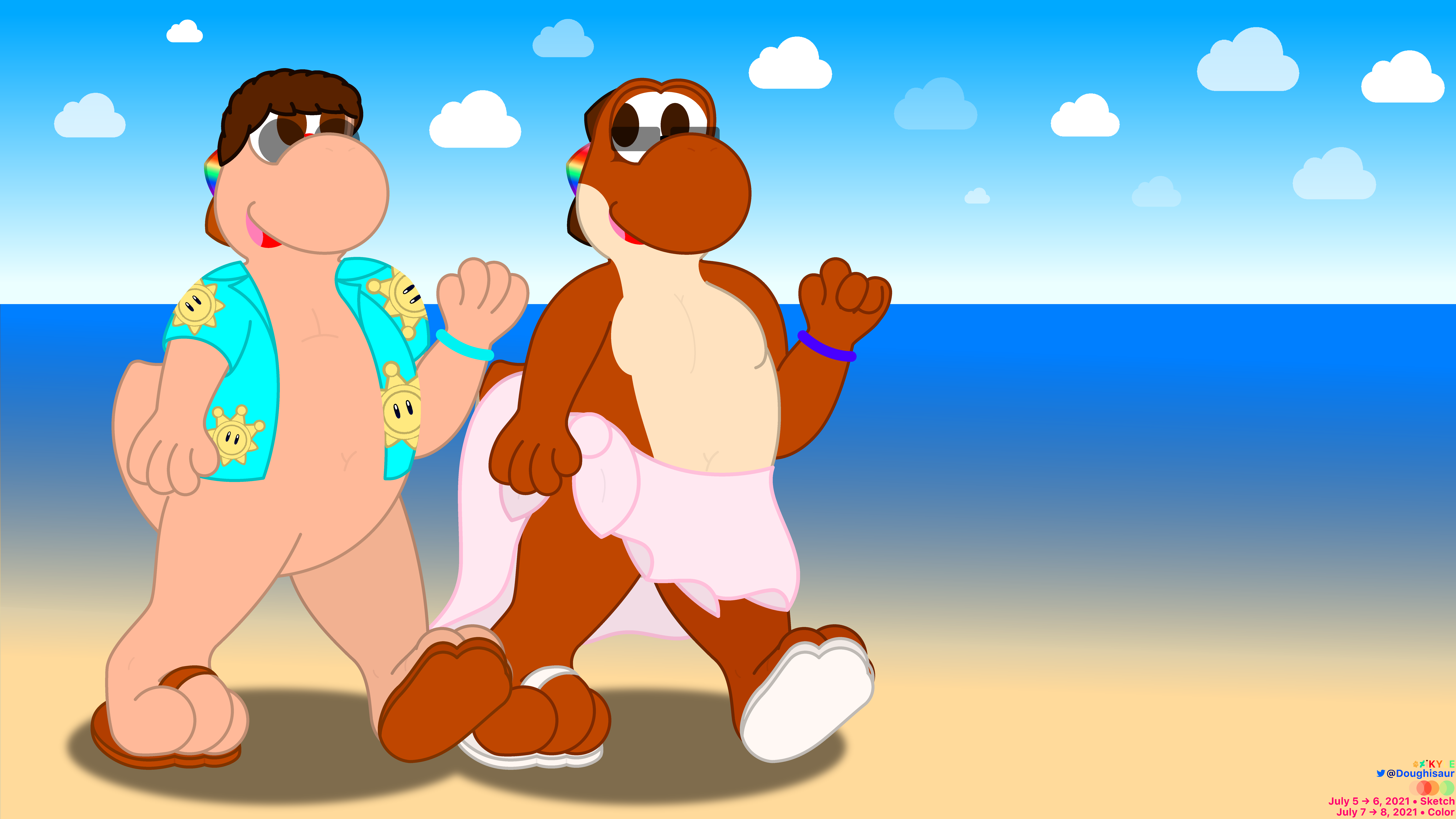 This is perhaps one of the largest pictures I've also ever made, coming in at 15,000 × 10,000, and that's really just a side effect of the canvas sizes I draw on. But it also ended up being this way because I was including three full-body characters in the same frame. If you couldn't tell, I really enjoy drawing full-body. Still, it's a reminder that in the future, I really should draw on smaller canvases and color on smaller canvases as well. That, or just start learning how to color on the iPad only. Shoutout to LilArrin and his custom PC for handling this mammoth project that didn't need to be this way, it handled the whole process so flawlessly that my iMac back home would've screamed trying to handle a canvas this size. But I love the way it came out, I loved drawing everyone in this picture, especially Mac. Sure, he doesn't wear much already, so that gave me the opportunity to come up with a summer outfit, and it's a good thing Beach Koopas are a thing because that was the perfect base to work with. Turn his glasses into sunglasses, give him a tank top and sandals and design both it and his beach towel with circuitry. Man, I love this look, I really wanna try and incorporate it into a new look for him sometime. Cinnamon was also a ton of fun to draw, it was just a bit harder with the angle she was in, and that includes her skirt.