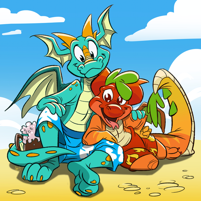 It's the middle of July in Aunov, which means the height of summer has arrived. It's the hottest time of year, the brightest and longest the sun is out. Folks are staying inside as much as possible in the air conditioning, in pools, or as we see our quartet, at the beach. We find Cinnamon, Cookie, and Mac all enjoying themselves on this summer equinox along the southern Aunova shores, basking in the sun as they all share a conversation and relax. Cherry, on the other handpaw, seems to have found himself volunteering (or being volun-told) to be Cookie's beach towel. But can you really be upset at that? You get free hugs from him!