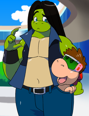 Work out in the galaxy can be pretty tiring for Pleebo and the crew of the Broken Arrow, so every now and again, the K'enehk finds his way to Aunov to visit his Koopa partner, but every so often, the latter finds his way coming up to the spacecraft to spend time with him, giving each other incredible views of the planet below and the far reaches of space. These two shy nerds lovingly embrace for a lovely picture together, with the great beyond as a backdrop.