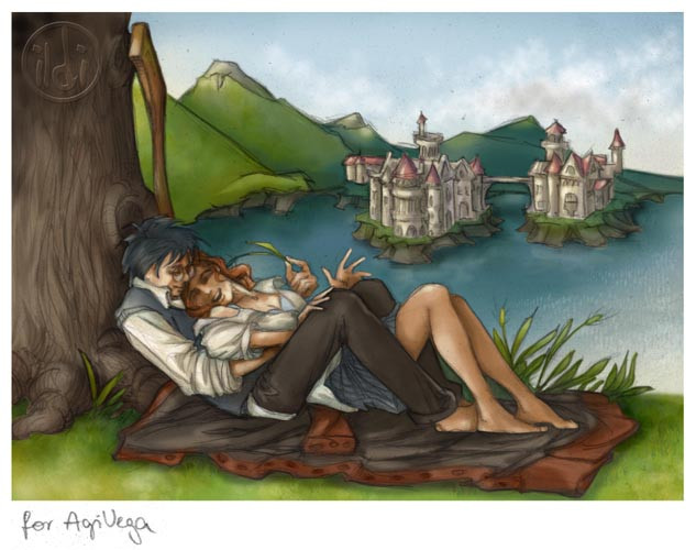 Another take on one of the classical HP slash pairings - Illustration for Rosesanguina 's Harry/Draco fiction (NC-17!!!), First Christmas .Commission Art! Please don't use it without Rosesanguina's prior definite permission!