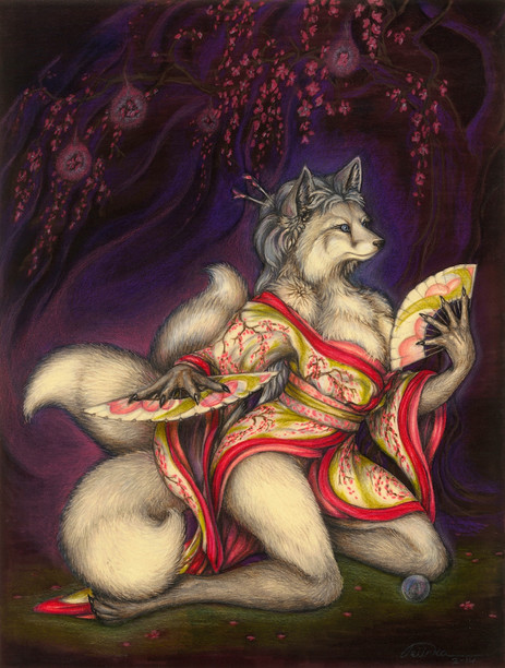 belated comment on what ~Sethrea said about the textile (and Im not trying to be negative here) - the point of what the kitsune is wearing is that the details are *slightly* off, as she doesnt know the intimate details of japanese culture; so I feel that Illahie got it completely right