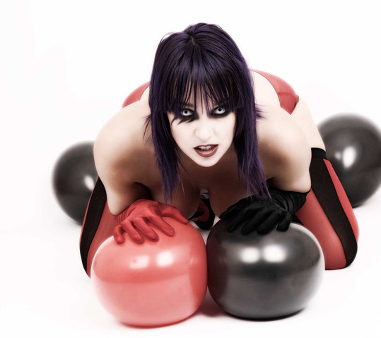 i really like the playful pose, coupled with the latex. sucha good dichotomy there. are those balloons behind her?