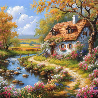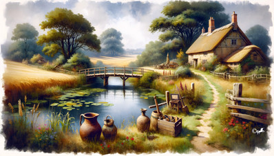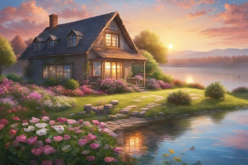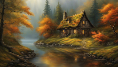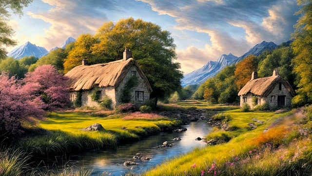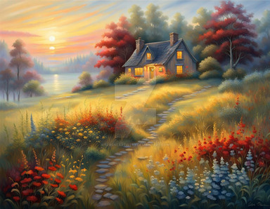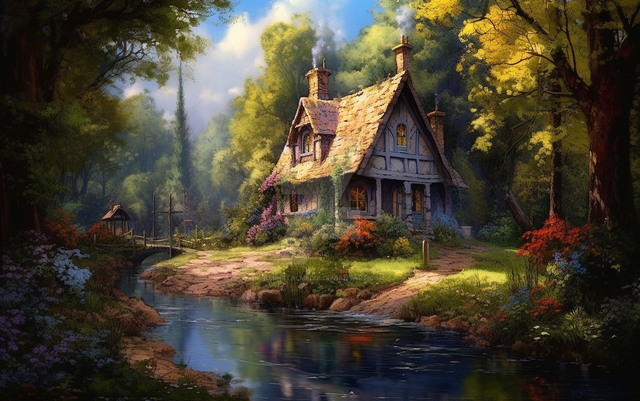 #cottage #countryside #fantasylandscape #oilpainting #picturesque #river #riverscape #romantic #rustic #storybook #stream #sunset #storybookillustration #cottagecore #cottagecoreaesthetic #aiartwork #midjourneyart