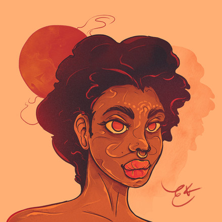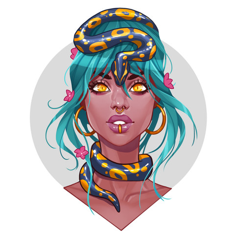 The first thing my eyes are drawn to are her eyes. You did an amazing job with their glowing nature. The palette used is exquisite, the cyan complements the Reds and oranges very nicely. One of the things I would say is that you could make the shadows and light a bit stronger, not too much, but just a little. I would also like to see a little more shading in the snake border, to make it pop.
