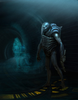 What I like about this piece is the fact that it actually resembles what the Jockey looked like in the original ALIEN film and it definitely looks very organic and very otherworldly. There are obviously strong Giger-esque tones in the way that there is this fusion of flesh and technology, giving this biomechanical look to the creature here in this particular picture. And what makes look very otherworldly is the fact that you have this dull blue lighting around the Engineer which makes it look like it's either in an Alien Hive or in a Space Jockey vessel that is still very much active. So awesome work in replicating the Engineer here.