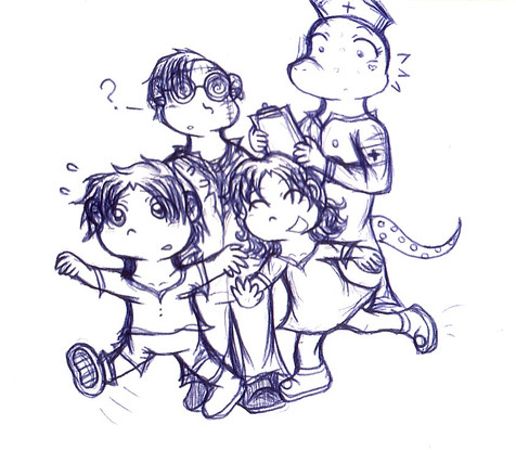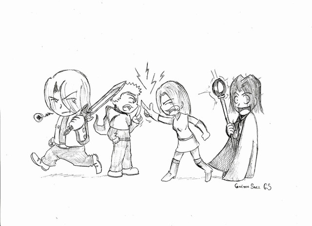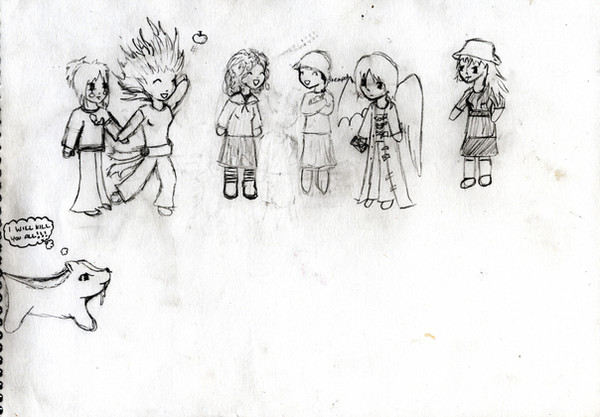 Was bored during school, and decided to draw teh trio with some weapons >:3
