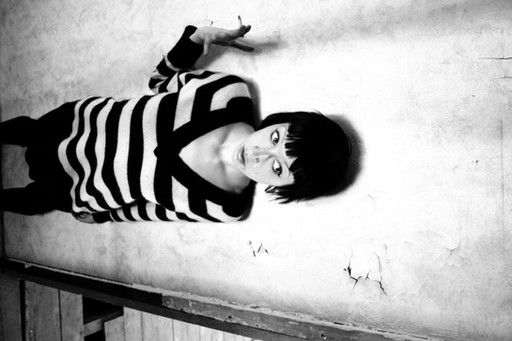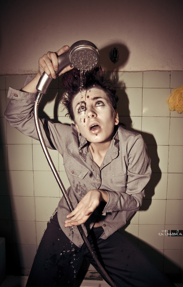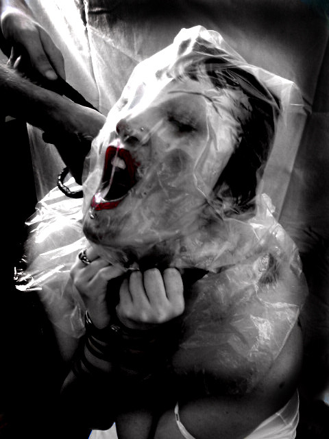 Looks like it's coming out of her although she got tied up in order to prevent that thing to come out through her... Cool pic!