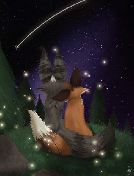 This is so beautiful! I love the lighting - especially the glowing effect! The background is bright and beautiful, almost to the point that the foxes look a little dull XD the dark of the cave brings them out more though. And I love the angle!