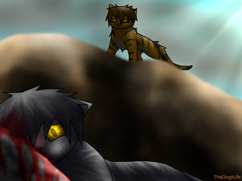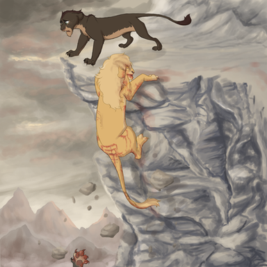 A single tear dripped down his cheek and dampened his deep red mane. He watched as her body was dragged under by the relatively gentle waters. He watched as her dainty face gently sank. Then a creak. The branches she was caught on snapped against the rock, and they too washed away. As she sank, her golden tail tuft flipped upwards as the branches rolled down on her. It shone in the fading light as the sun broke through a gap in the clouds. He reached out a paw, contemplaing whether his life was worth living now, but he stopped himself. He watched as her tail tuft gently sank, and whispered
