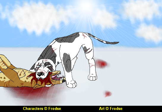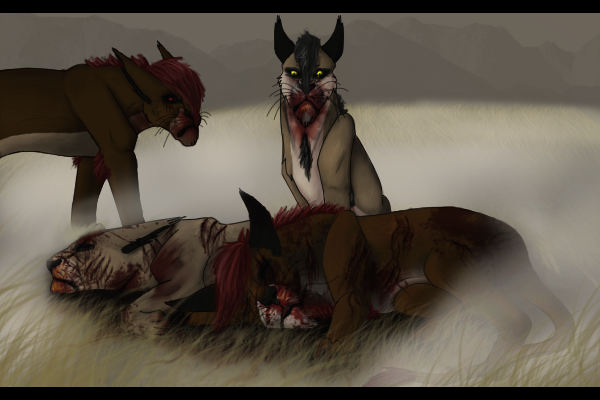 Agili's body was crushed between branches, her left front paw twisted painfully around and wedged between an old fallen tree washed down the river and a huge rock. A twig speared her delicate paws, her claws ripped and torn. She'd tried to grasp something, but it was too much for her. A chunk was taken out of her ear...more like some claw scratches than tree damadge. Her golden fur that others so envied was bruized and stained with blood, her closed eyes covered in blood.