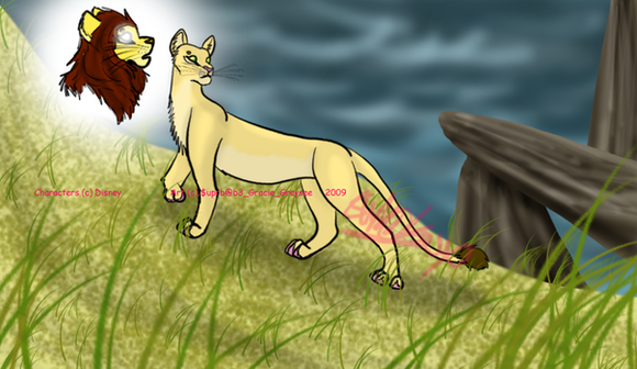 "Agili! Agili! Please, where are you?" He was terrified. He had looked everywhere. He ran over to the gorge and out onto a rock that jutted out over the river. Maybe he had a better view point here? Buno scanned the area. Nothing. He sadly lowered his head...the river was unusually low, probably due to the draught...as he sighed and looked into the water, he noticed something. Something caught in the pile of wood that had always been there...it was a pale colour. An antelope, maybe? Buno dashed to another rock that was lower this time, and as he got closer and closer he realised...that was no antelope...it had a golden tail tuft, and clawed paws straggled across the broken branches. A lioness! He ran still further down to the nearest rock he could...and then, his heart sank.