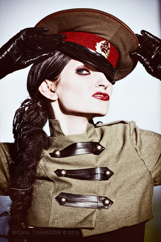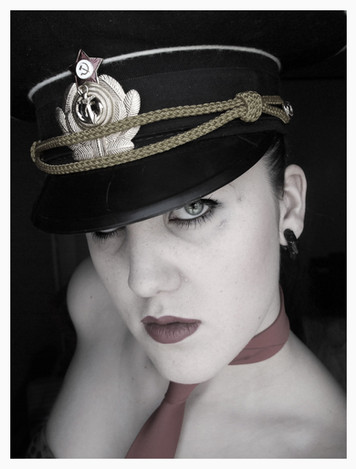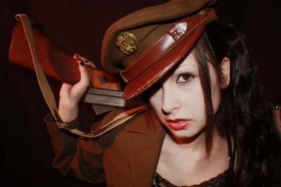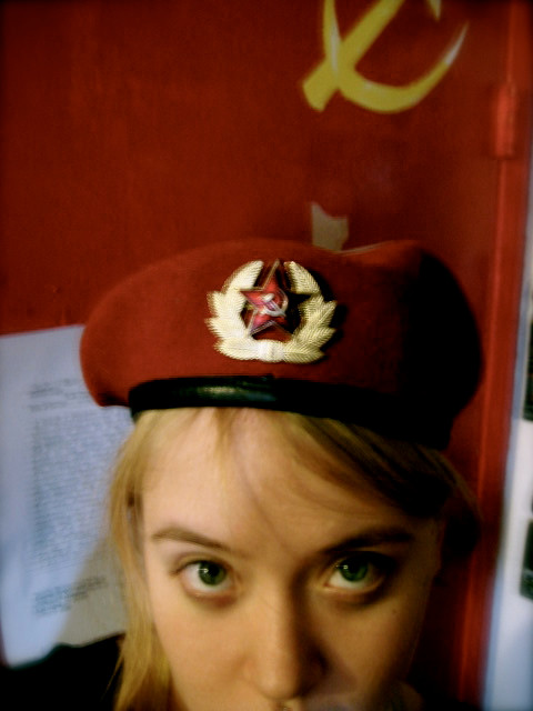 She looks lovely. Call me weird, but I love attractive (well, not just supermodels, normal gals etc) ladies in military gear. She contrasts the cold militarian force of the uniform by cocking the hat, looking incredibly cute and sweet, and she has a playful nature while wearing garb of opression and horror. Not that Im getting at the USSR or anything.... *sarcastic look*