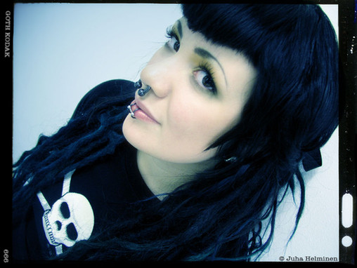 NIce shot. You have captured the latex with a soft even glow and no hotspots. Well framed with buckle, nose ring, and earings all adding interest and flow of the pic. Thos eyes though