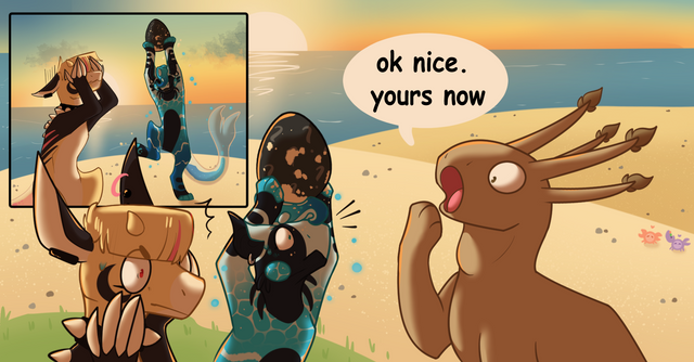 In the progress of attempting to find the rest of their team, Sam-sip came across a familiar-looking egg which that weird creature (Smeak) kept shoving visuals of said egg in their face. For good measure, they ultimately decided to hand it back, but then this happened...