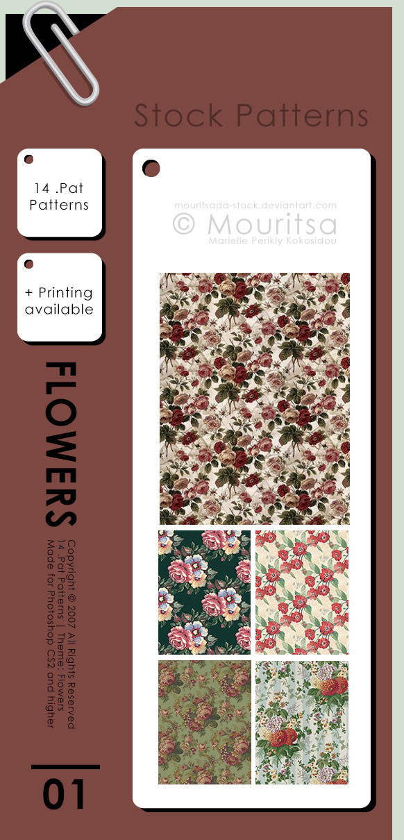 Most of my patterns, including Pattern Pack - Flowers are made based on scanned decoration papers that I have either personally bought from bookstores or they are the wrappings of gifts I have received, then cleaned and enchanced in Photoshop or Illustrator. Surely, quite a few stock artists or artists in general use they same method for creating their works and based on that, I suppose some sites may have similar works or even the same.