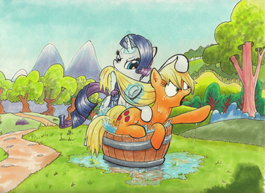 I like how it appears that Rarity is critiquing AJ's mane as they're crossing the mud. That's cute.