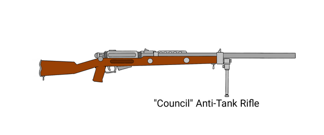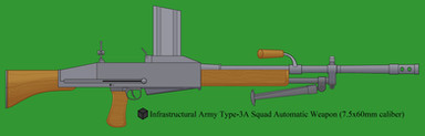 The Hawkins Mark-IV Conscript Rifle was the most recent creation of Hawkins Armaments. In the last few months of the Sixth Colonial War, the insidious Dorionese Commonwealth began issuing it's soldiers with self loading rifles. No cocking of levers or operating of bolts was required by the user to bring another round out of the magazine, all that he needed to do was pull the trigger. In response, the government commissioned that something better be made from Hawkins Armaments. Something which was deadlier and cheaper to be issued in bulk across the Empire for the millions of conscripts. What they got was this: the Mark-IV Conscript rifle. Easy to produce in large quantities, able to fire 7x42mm rounds at 600 RPM or semi-automatically with a 25 round magazine and so simple that even the least educated colonial conscript can master it's maintenance while it cost very little to make. Soon enough, millions of these rifles were rolling off the assembly lines. Even so, it was not without it's teething problems as it's construction (especially when made from colonial armories) was not the highest in the world and the fact that it ejected cases upwards could be problematic to soldiers in the field.