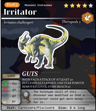 A small spinosaurid at 6 meters in lenght, known from a skull bought from poachers, cleaning the plaster they had used to alter it irritated those who studied it